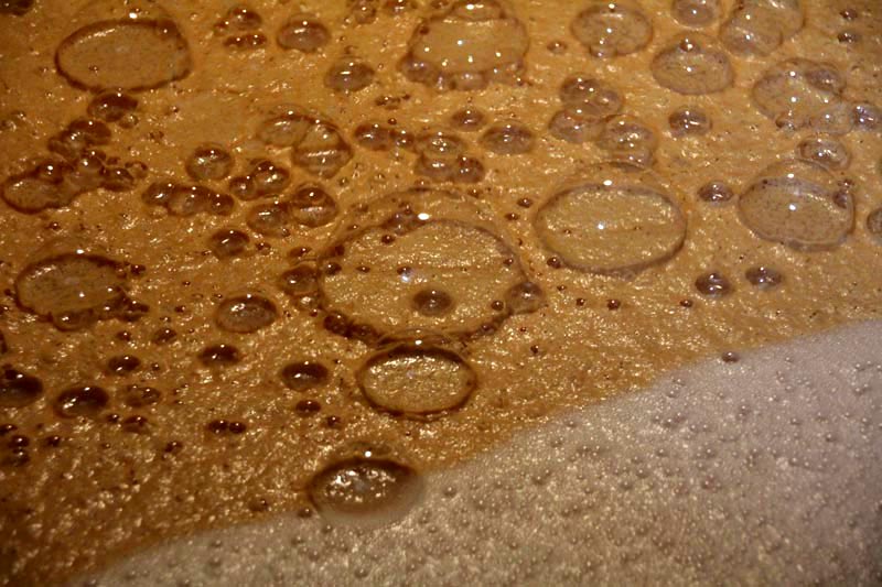 durch den Gärungsprozess entstehenen Schaum niedrig hält. Nach der Gärzeit, die teilweise sehr lebhaft ablaufen ist, ist eine bierähnliche Flüssigkeit (Wash) entstanden mit einem Alkoholgehalt von 9,5% bis 10%. |